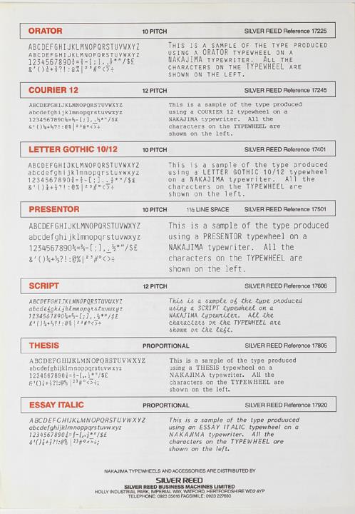 Schriftartenverzeichnis für elektronische Schreibmaschine Nakajima