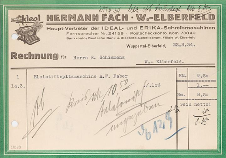 Rechnung der Büromaschinenhandlung Hermann Fach, Wuppertal-Elberfeld adressiert an Herrn Schiemetz, W.-Elberfeld; datiert 22.3.1934 Maschinenschrift, Handschrift