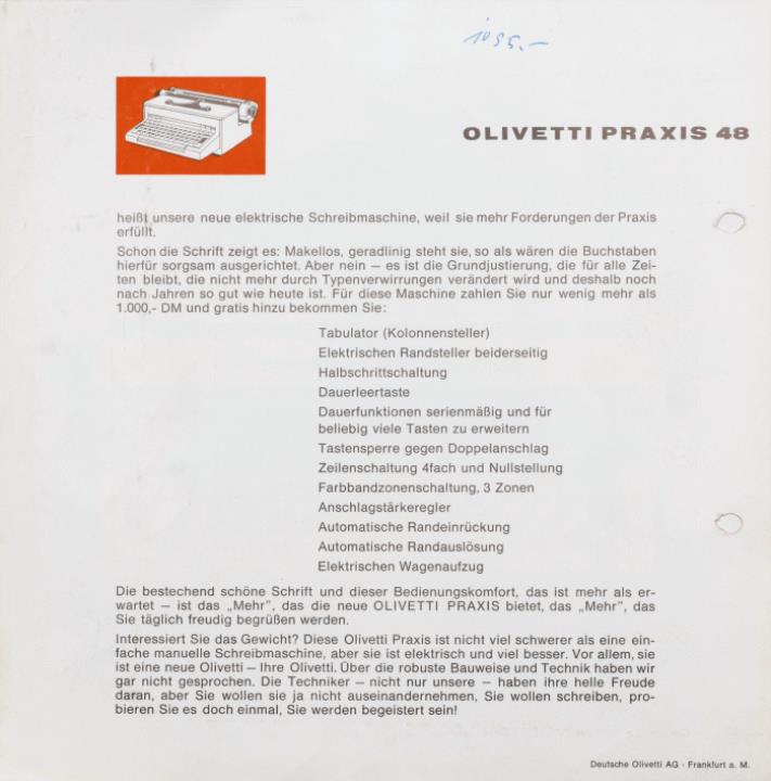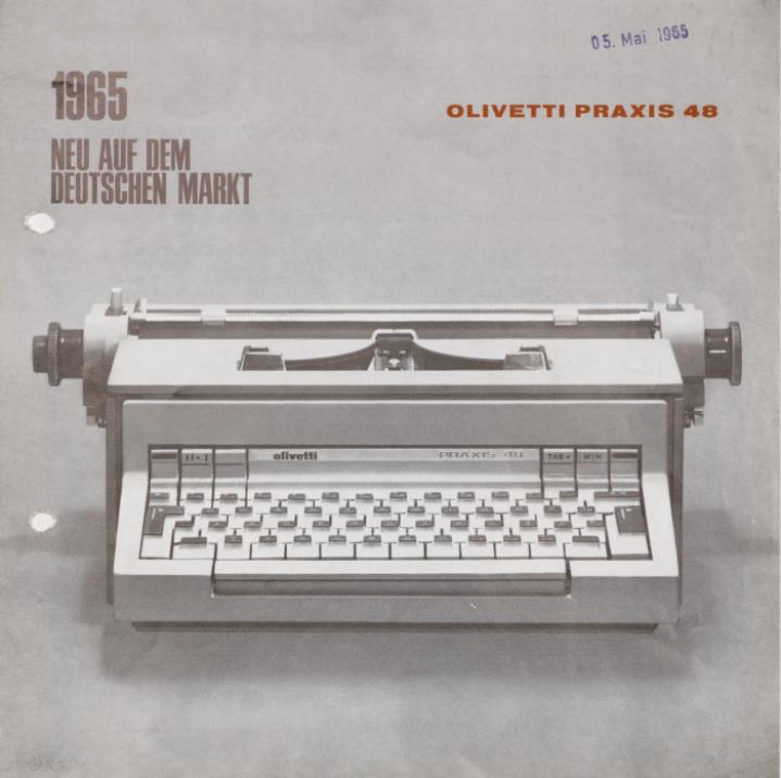 Prospekt für Schreibmaschine Olivetti Praxis 48. 1965 neu auf dem deutschen Markt mit Datumstempel versehen