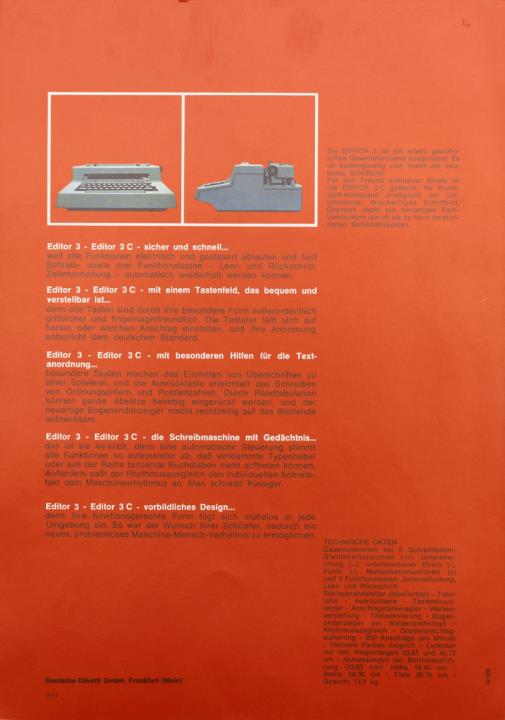 Prospekt für elektrische Schreibmaschine Olivetti Editor 3 und 3C Nr. 3-71 / 42026