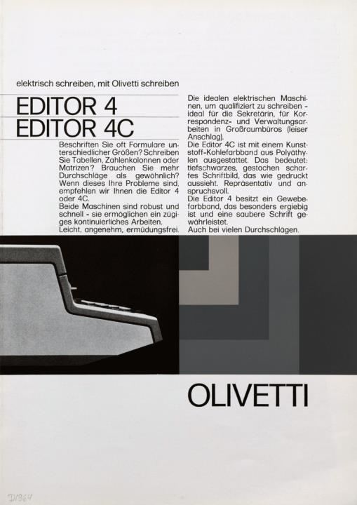 Faltprospekt für elektrische Schreibmaschine Olivetti Editor 4 und 4C elektrisch schreiben, mit Olivetti schreiben Nr. V.V. (9-71)