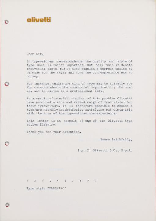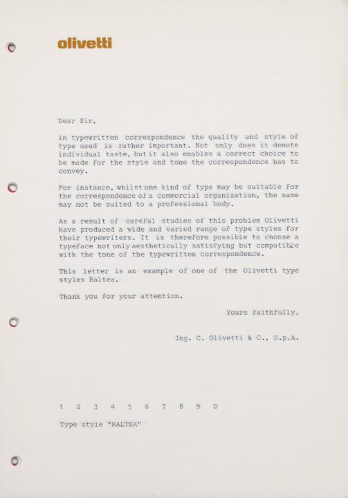 Musterbriefe verschiedener Schriftarten für elektrische Schreibmaschine Olivetti Editor 4C Nr. 2000478/5M/HC.12.72