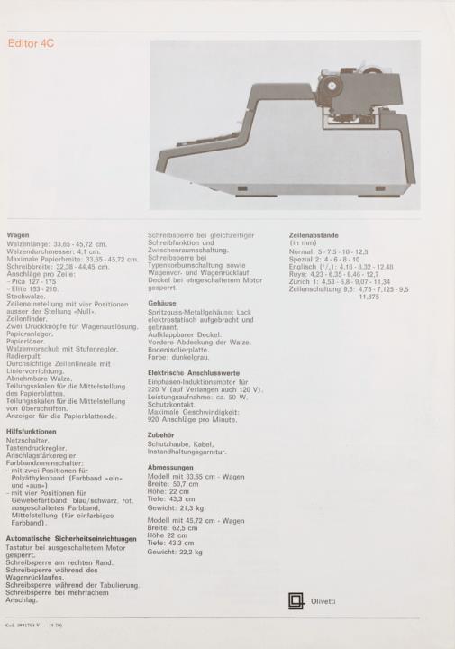 Prospekt für elektrische Schreibmaschine mit konstantem Wagenschritt und Polyäthylenband (Kohlefarbband) Editor 4C