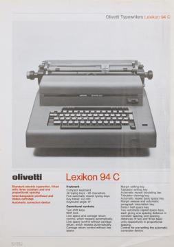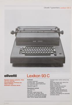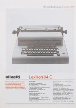 Prospekt für elektrische Büroschreibmaschine Olivetti Lexikon 94 C mit konstantem und proportionalem Wagenschritt, austauschbarem Schreibkopf, austauschbarer Farbbandkassette und automatischer Korrekturvorrichtung