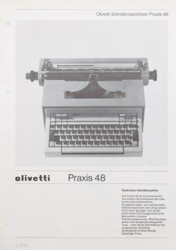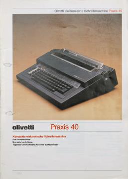 Prospekt für elektronische Schreibmaschine Olivetti Praxis 40 Drei Schaltschritte, Korrekturvorrichtung, Typenrad und Farbband-Kassette austauschbar Nr. 3925504 B (12-81) D