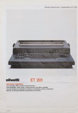 Faltprospekt für elektronische Schreibmaschine mit Display Olivetti ET 201 Vier Zeichenabstände, Typenrad und Farbband-Kassetten austauschbar, Zwei-Zeilen-Speicher für die automatische Korrektur, Speicher Nr. 09/002/SM/80