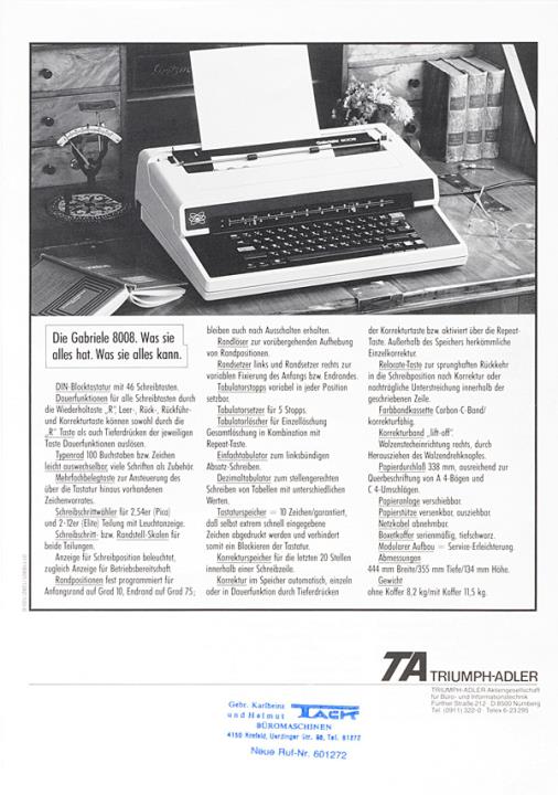Prospekt für Schreibmaschine Triumph-Adler Gabriele 8008 Nr. 01116901/1282/100/6
