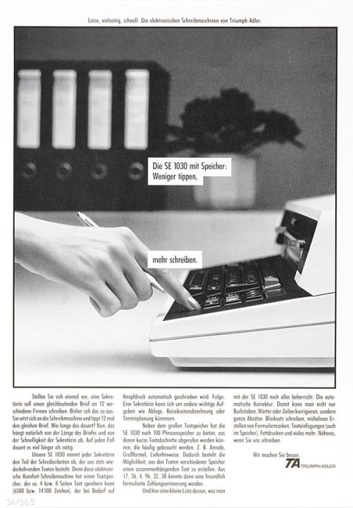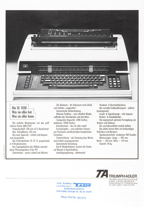 Prospekt für Schreibmaschine Triumph-Adler SE 1030 Weniger tippen, mehr schreiben Nr. 01116701/1082/50/6