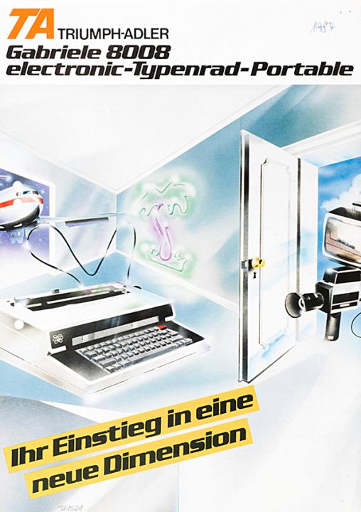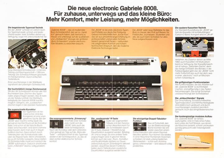 Faltprospekt für Schreibmaschine Triumph-Adler Gabriele 8008 Ihr Einstieg in eine neue Dimension Nr. 01 1147 01/382/100/40 Datum handschriftlich vermerkt