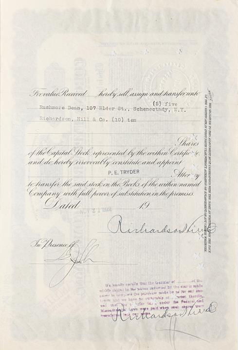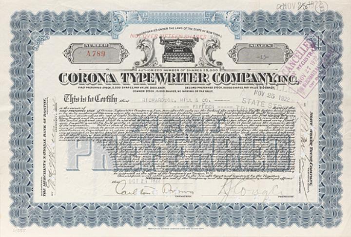 Aktie Nr. A789 der Corona Typewriter Company, Inc. über 15 Anteile ausgestellt auf Richardson, Hill & Co.; datiert 27.10.1922 Druck: Franklin Lee Division - American Bank Note Co.