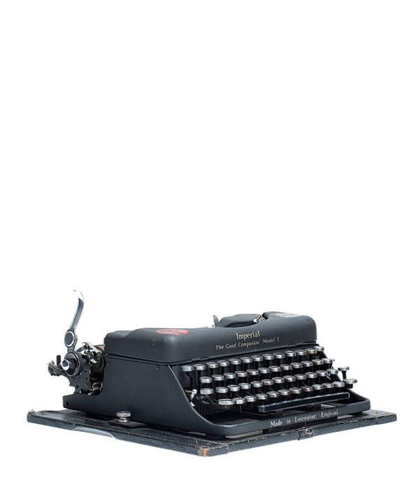 Schreibmaschine Imperial Modell Good Companion T; auf Unterseite des Tragekoffers montiert Eigenschaften: Typenhebel, Vorderanschlag, einfache Umschaltung, Farbband, Tabulator Tastatur: universal, vierreihig, 44 Schreibtasten, Seriennummer 2GB299