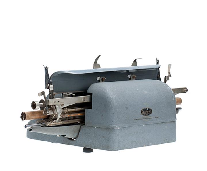 Schreibmaschine Coxhead Modell DSJ Eigenschaften: Typensegment, Druckhammeranschlag, doppelte Umschaltung, Karbonband, Breitwagen, Tabulator, ausziehbares Fach mit 15 verschiedenen Schrift-Typenschiffchen Tastatur: universal,dreireihig, 30 Schreibtasten Konstruktion/Design: Ralph Cramer Coxhead, Frank H. Trego, Charles Winfred Norton, Bently Pratt Raak Besonderheit: Schriftsetzmaschine in Nachfolge der Hammond Varityper, Seriennummer DSJ 2280 16