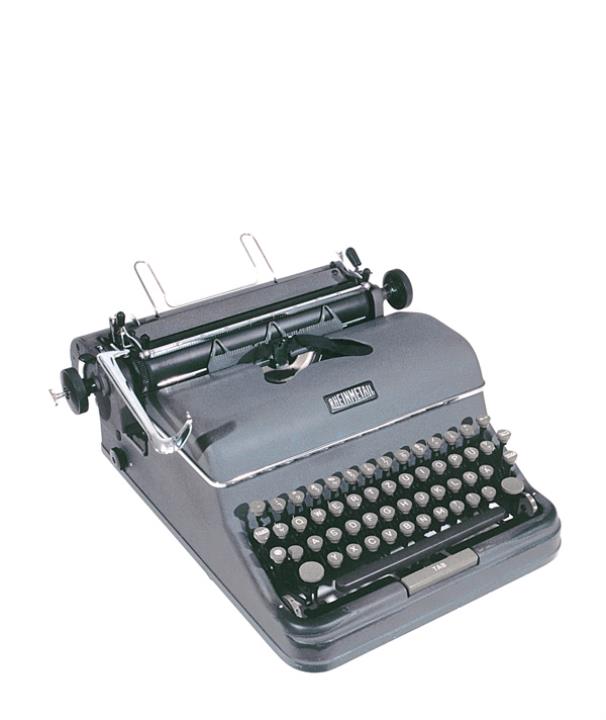 Schreibmaschine Rheinmetall Modell GS Eigenschaften: Typenhebel, Vorderanschlag, einfache Umschaltung, Farbband, Tabulator Tastatur: universal, vierreihig, 45 Schreibtasten, Seriennummer 87514