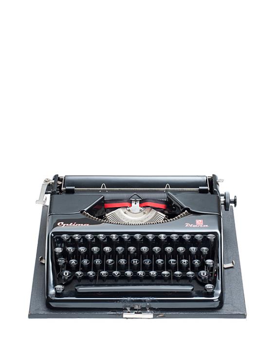 Schreibmaschine Optima Modell Plana (Farbe schwarz) Eigenschaften: Typenhebel, Vorderanschlag, einfache Umschaltung, Farbband, Tabulator Tastatur: universal, vierreihig, 45 Schreibtasten, Seriennummer 231943