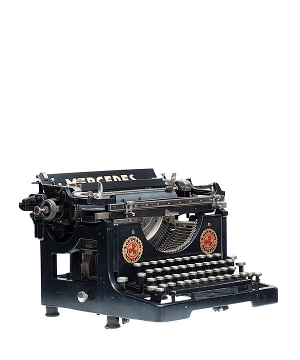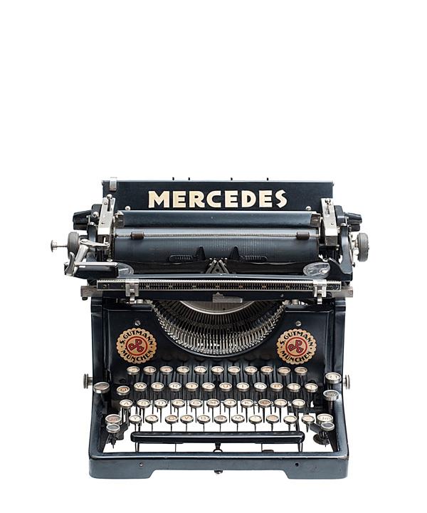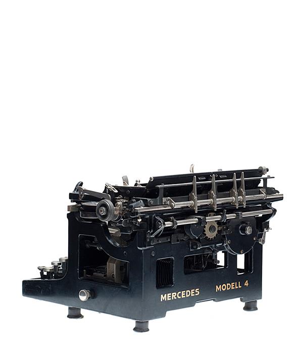 Schreibmaschine Mercedes Modell 4 Eigenschaften: Typenhebel, Vorderanschlag, einfache Umschaltung, Farbband, Tabulator Tastatur: universal, vierreihig, 45 Schreibtasten weitere Aufschrift: S. Gutmann München, Seriennummer 130338 / 8757