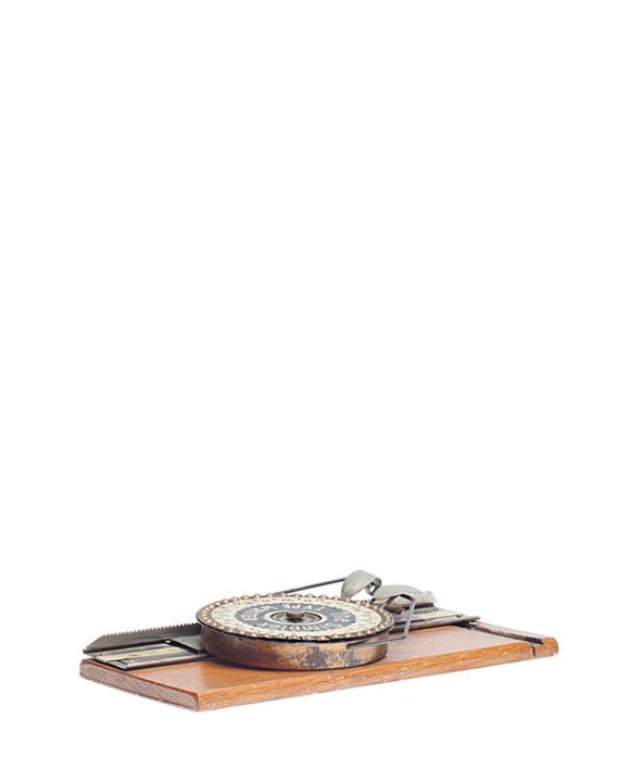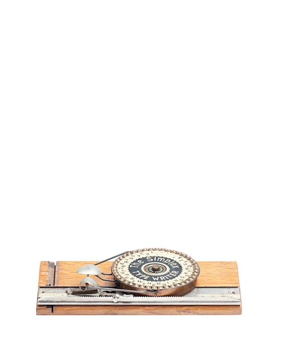 Schreibmaschine Simplex Eigenschaften: Zeiger, Großbuchstaben, Typenscheibe aus Gummi (fehlt), Oberanschlag, Farbkissen Konstrukteur: Arnaldo Myrthle English, Philip Becker