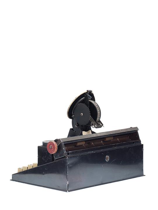 Schreibmaschine Dial De-Luxe Eigenschaften: Zeiger, Typenrad, Großbuchstaben, Oberanschlag, Farbröllchen, Blendtastatur aus Blech Konstrukteur: Samuel Inving Berger