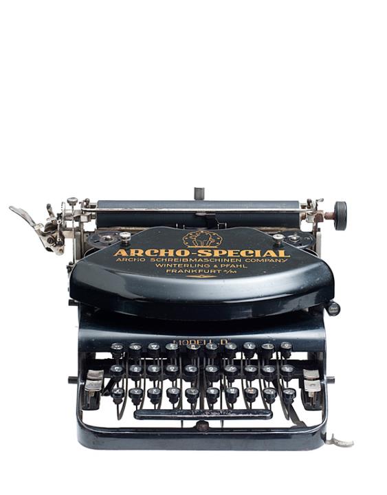 Schreibmaschine Archo Modell Spezial / Modell D Eigenschaften: Typenstangen, Vorderanschlag, doppelte Umschaltung, Farbband Tastatur: universal, dreireihig, 30 Schreibtasten Konstrukteur: Karl Winterling Besonderheit: vereinfachte Ausführung der Schreibmaschine Archo D, Seriennummer 10076