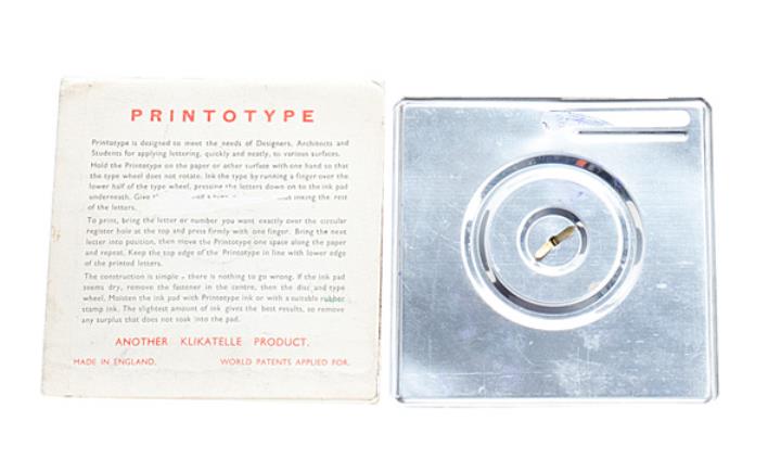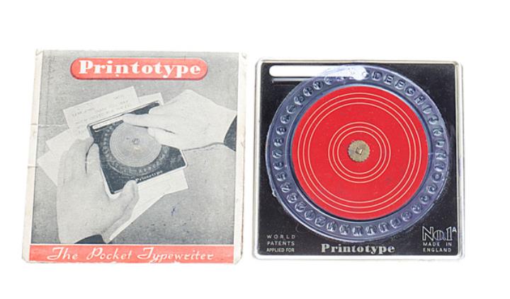 Schreibmaschine Printotype Pocket Typewriter mit Einschubhülle Eigenschaften: Zeiger/Eintaster, Typenscheibe aus Plastik, Großbuchstaben, Oberanschlag, Farbkissen Konstrukteur: John Pinkney Gowland Besonderheit: wurde zum Schreiben direkt auf das Papier gelegt