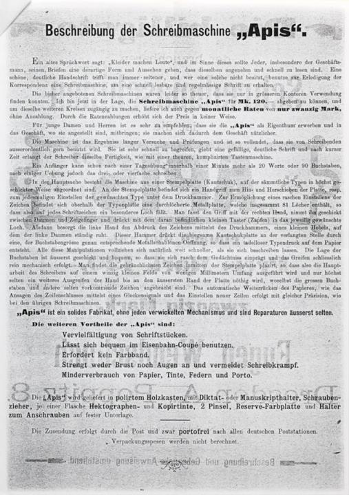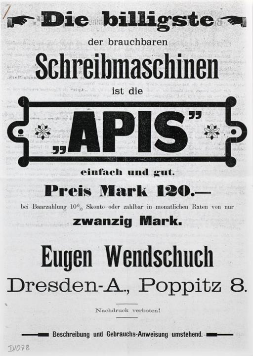 Fotokopie eines Prospekts für Schreibmaschine Apis mit Beschreibung und Bestellschein, zu richten an Eugen Wendschuch, Dresden-A., Poppitz 8 Datum vermerkt