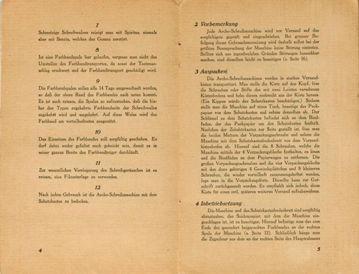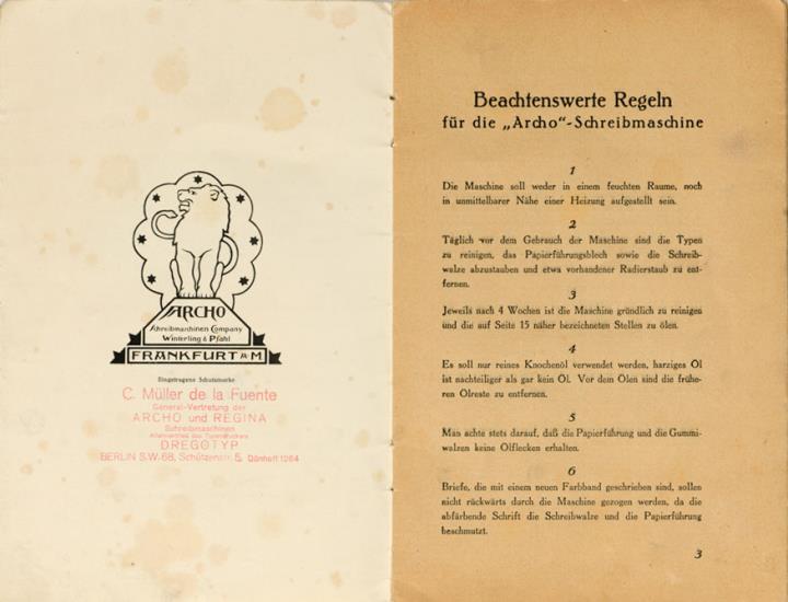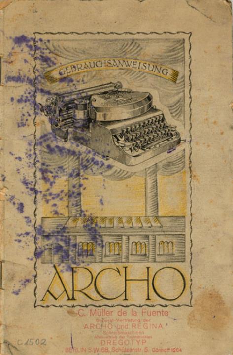 Bedienungsanleitung für Schreibmaschine Archo Modell D mit handschriftlichem Vermerk