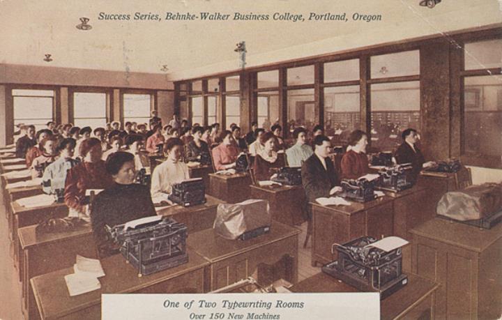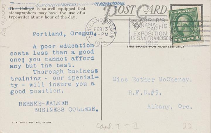 Illustrierte Postkarte; Fotografie, koloriert Rückseite: Unterrichtsraum mit Schülern und Schreibmaschinen; weiterer Text: One of Two Typewriting Rooms. Over 150 New Machines Vorderseite: beschrieben (Maschinenschrift); adressiert an Miss McChensy, Albany; Briefmarke U.S. Postage 1 Cent; Poststempel Portland/Feb 13 1913