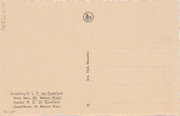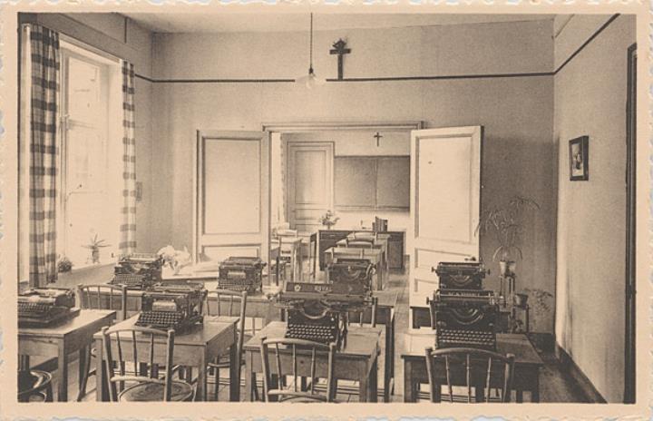 Illustrierte Postkarte; Fotografie, monochrom Rückseite: Unterrichtsraum mit Schreibmaschinen Vorderseite mit Beschreibungstext: Institut N D. de Gaverland, Melsele-Waes; nicht beschrieben