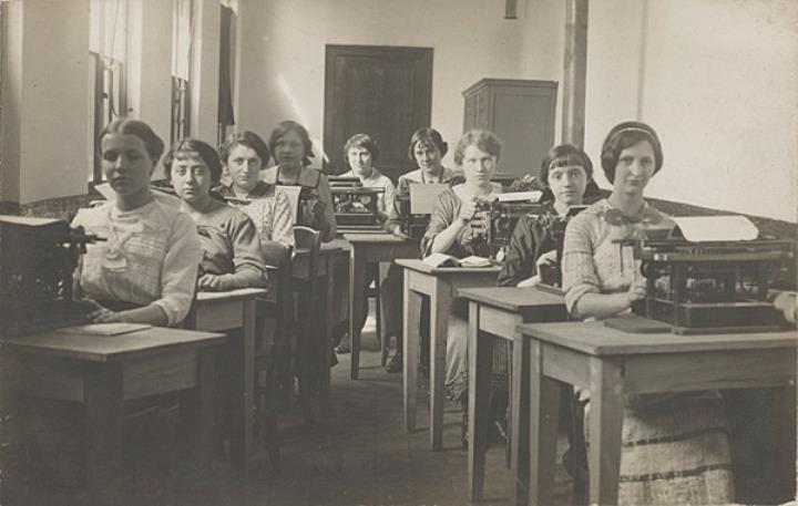 Illustrierte Postkarte; Fotografie, monochrom Rückseite: Unterrichtsraum mit Schülerinnen und Schreibmaschinen Vorderseite nicht beschrieben