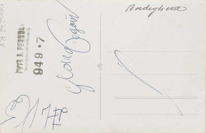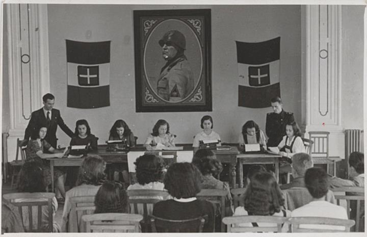 Illustrierte Postkarte; Fotografie, monochrom Rückseite: Aufnahme bei einem Maschinenschreibwettbewerb vor Publikum; junge Frauen mit Schreibmaschinen, stehend zwei Aufsichtspersonen, an der Wand hängend zwei Fahnen und ein Porträt von Benito Mussolini Vorderseite mit Vermerk: Bordighera