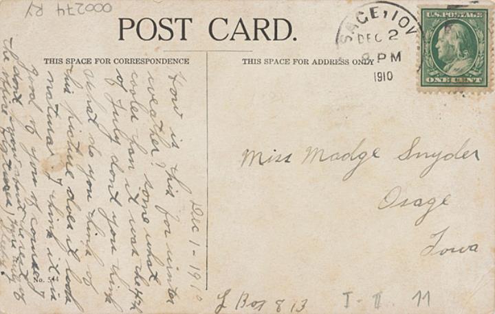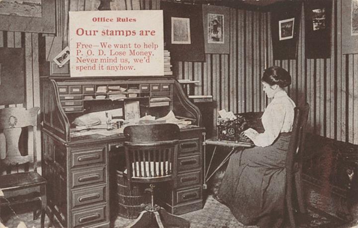 Illustrierte Postkarte; Fotografie, Grafik, polychrom Rückseite: Büroansicht; Frau/Sekretärin mit Schreibmaschine, Kartusche mit Text Vorderseite: beschrieben, adressiert an Miss Snyder, Osage; Briefmarke U.S. Postage One Cent; Poststempel Osage/Dec 2 1910