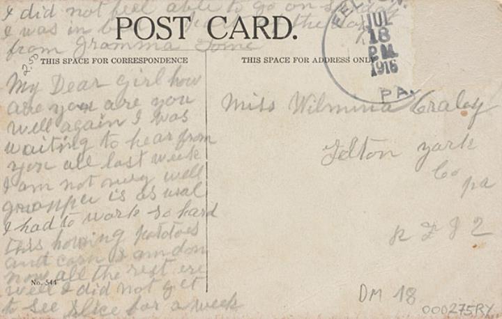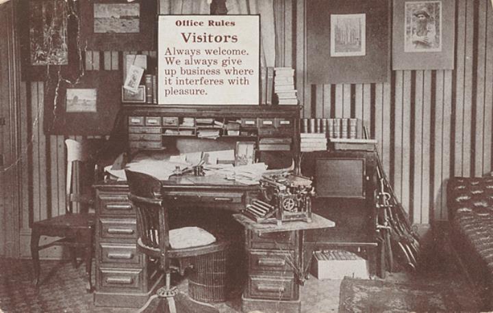 Illustrierte Postkarte; Fotografie, Grafik, polychrom Rückseite: Büroansicht, Kartusche mit Text Vorderseite: beschrieben, adressiert; Poststempel Felton/Jul 18 1916