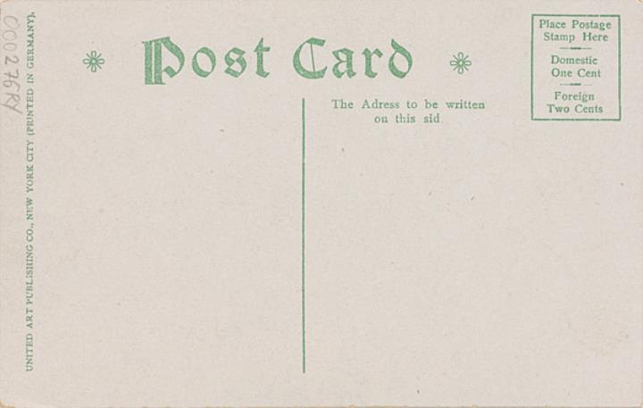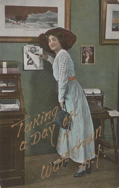 Illustrierte Postkarte; Fotografie, polychrom Rückseite: Büro mit Schreibmaschine und Sekretärin, welche ein Kalenderblatt abreißt; mit Goldstift beschrieben Vorderseite nicht beschrieben