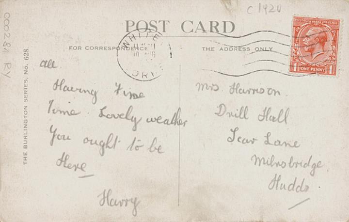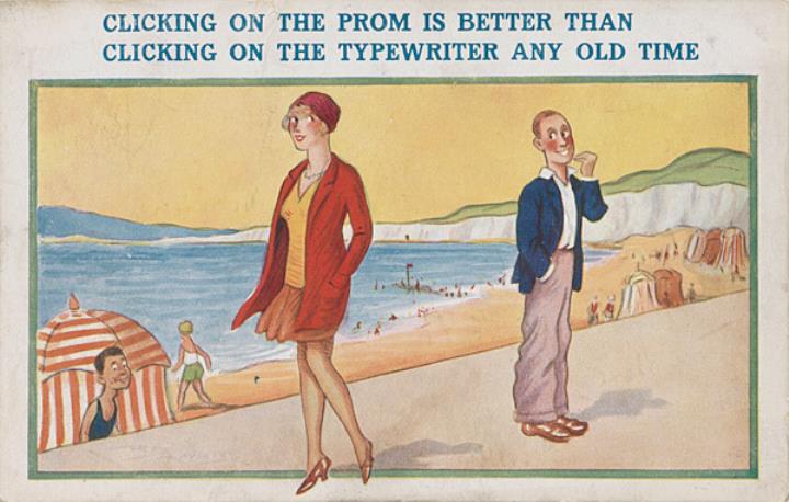 Illustrierte Postkarte; Grafik, polychrom; Burlington Series Nr. 628 Rückseite: Frau beim Spazieren entlang der Strandpromenade Vorderseite: beschrieben; adressiert; Briefmarke Postage Revenue (U.K.) One Penny; Poststempel unleserlich