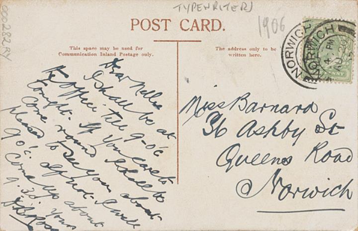 Illustrierte Postkarte; Grafik, polychrom Rückseite: Büroszene; Sekretärin mit Schreibmaschine, umgeben von männlichen Mitarbeitern Vorderseite: beschrieben; adressiert an Miss Barnard, Norwich; Briefmarke Postage Revenue (U.K.) Halfpenny; Poststempel Norwich/Au 20 1907