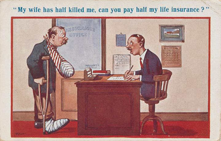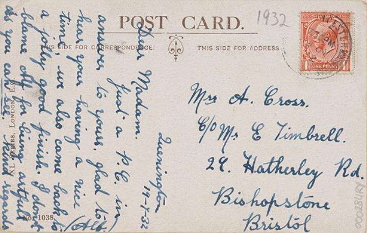 Illustrierte Postkarte; Grafik, polychrom; XL Series Nr. 1038 Rückseite: Szene in einem Versicherungsbüro Vorderseite: beschrieben; adressiert an Mrs. Cross, Bristol; Briefmarke Postage Revenue (U.K.) One Penny; Poststempel 19 JY 1932