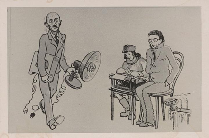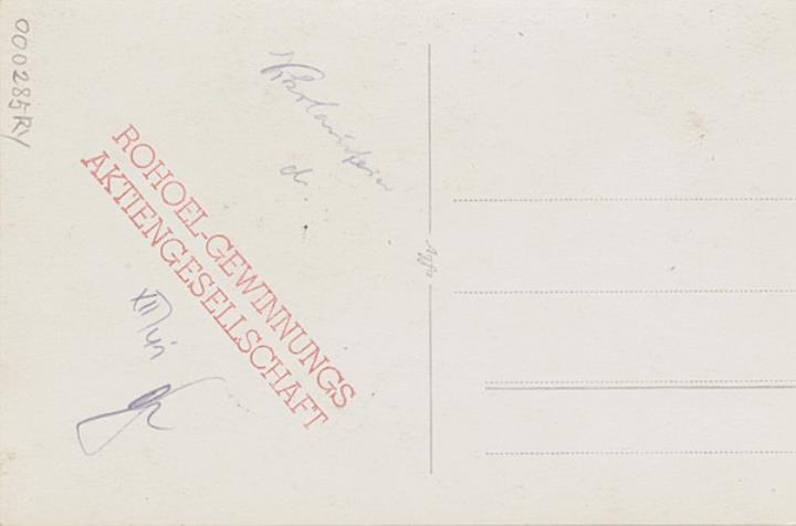 Illustrierte Postkarte; Grafik, monochrom Rückseite: zwei Männer und eine Frau/Sekretärin mit Handschuhen beim Maschinenschreiben Vorderseite mit Stempel: Rohoel-Gewinnungs Aktiengesellschaft