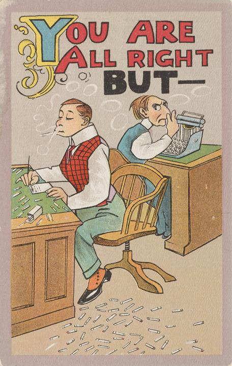 Illustrierte Postkarte; Grafik, polychrom; Nr. 102 Rückseite: Büroszene; Sekretär mit Schreibmaschine hält sich die Nase zu, am Tisch daneben Mitarbeiter als Kettenraucher Vorderseite nicht beschrieben