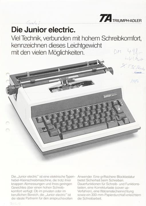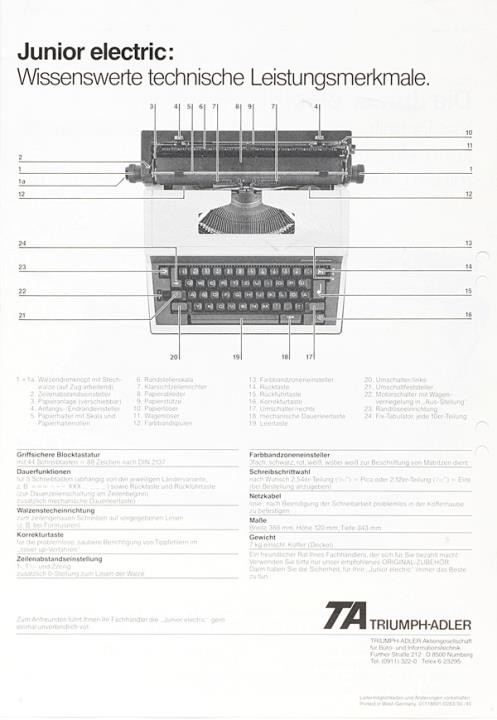 Prospekt für Schreibmaschine Triumph-Adler Junior electric Nr. 01118601/0283/30/40