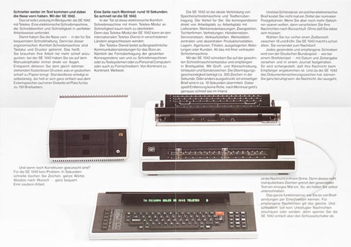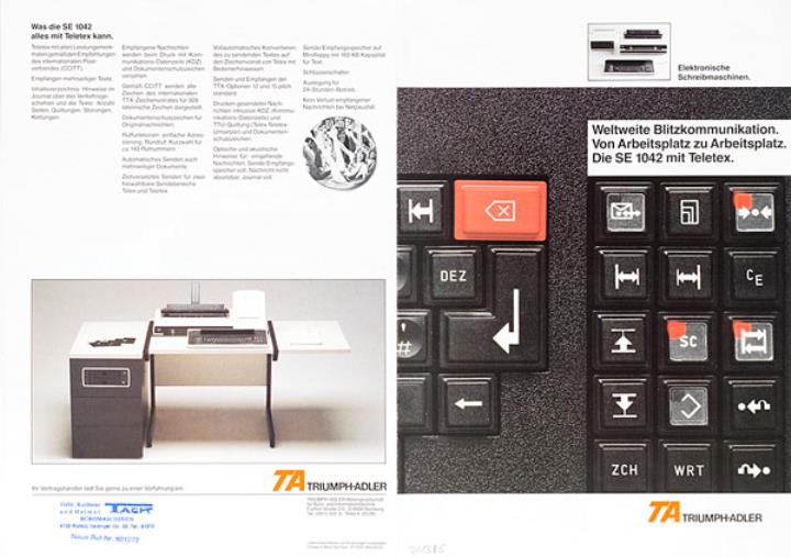 Faltprospekt für elektronische Schreibmaschine Triumph-Adler SE Weltweite Blitzkommunikation. Von Arbeitsplatz zu Arbeitsplatz Nr. 01119101/683/40/23