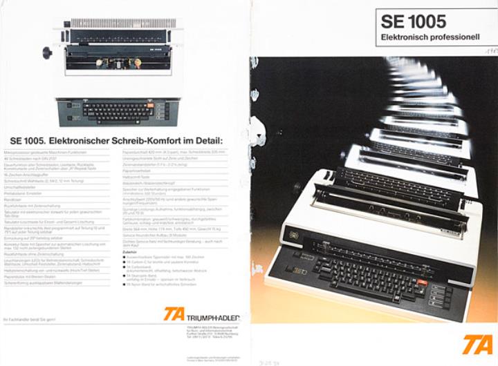 Faltprospekt für elektronische Schreibmaschine Triumph-Adler SE 1005 Nr. 01122601/585/50/23 Datum handschriftlich vermerkt