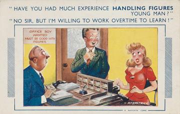 Illustrierte Postkarte; Grafik, polychrom Bamforth Comic Series Nr. 1417, Grafik: Fitzpatrick Rückseite: Büroszene; Vorgesetzter und Mitarbeiter beim Vorstellungsgespräch, Sekretärin mit Schreibmaschine Vorderseite nicht beschrieben