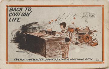 Illustrierte Postkarte; Grafik, polychrom; Nr. 2296 Rückseite: Büroszene; Sekretärin mit Schreibmaschine, Mitarbeiter duckt sich hinter dem Schreibtisch; weiterer Text: Even a typewriter sounds like a machine gun Vorderseite nicht beschrieben