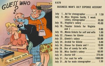Illustrierte Postkarte; Grafik, polychrom Rückseite: links Büroszene mit Ehefrau, Vorgesetztem und Sekretärin mit Schreibmaschine; rechts Auflistung "Business Man's July Expense Account" Vorderseite nicht beschrieben