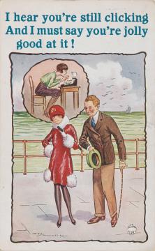 Illustrierte Postkarte; Grafik, polychrom; Nr. 3190 Rückseite: Sekretärin mit Schreibmaschine (Rundbild) und beim Spazieren entlang der Uferpromenade in Begleitung eines Mannes Vorderseite: beschrieben, adressiert; Briefmarke Postage Revenue (U.K.) One Penny; Poststempel South Yardley/16 JY 1907