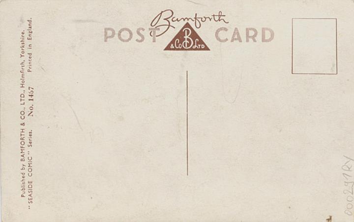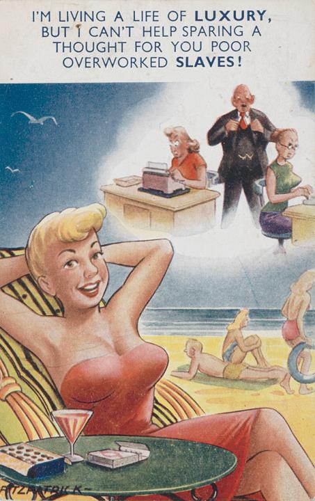 Illustrierte Postkarte; Grafik, polychrom Seaside Comic Series Nr. 1457, Grafik: Fitzpatrick Rückseite: Sekretärin im Urlaub am Strand, im Gedanken (Vignette) bei den Mitarbeiterinnen im Büro Vorderseite nicht beschrieben