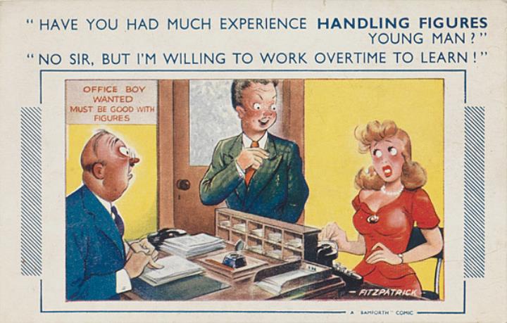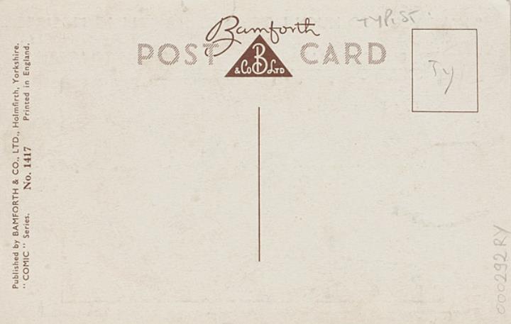 Illustrierte Postkarte; Grafik, polychrom Bamforth Comic Series Nr. 1417, Grafik: Fitzpatrick Rückseite: Büroszene; Vorgesetzter und Mitarbeiter beim Vorstellungsgespräch, Sekretärin mit Schreibmaschine Vorderseite nicht beschrieben