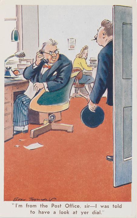 Illustrierte Postkarte; Grafik, polychrom; Nr. 1390 Rückseite: Büroszene; Vorgesetzter am Telefon, Sekretärin mit Schreibmaschine, Mann betritt den Raum Vorderseite nicht beschrieben
