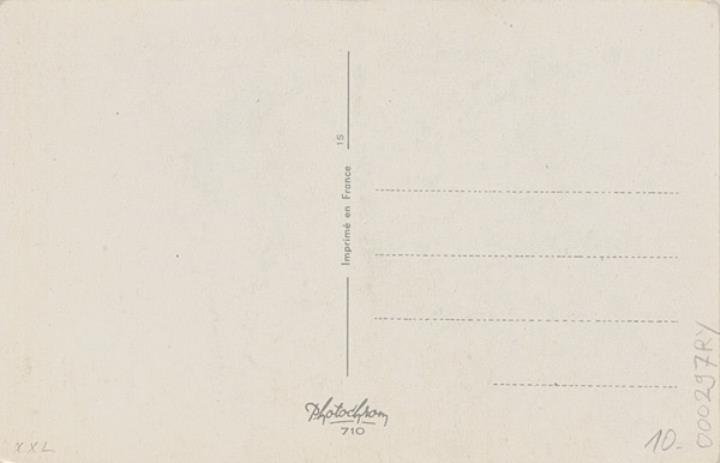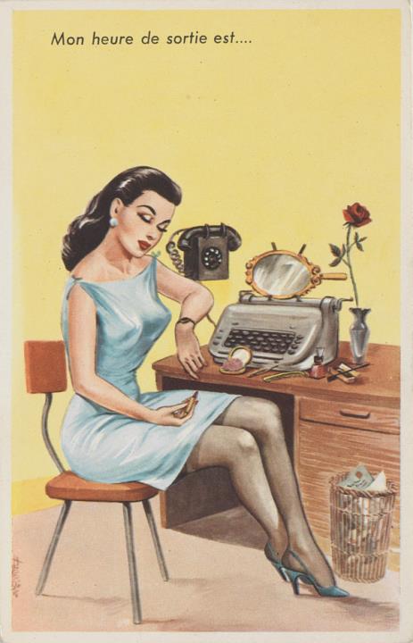 Illustrierte Postkarte; Grafik, polychrom; Nr. 710 Rückseite: Sekretärin beim Schminken, auf Armbanduhr blickend; Schreibmaschine als Spiegelhalter Vorderseite nicht beschrieben