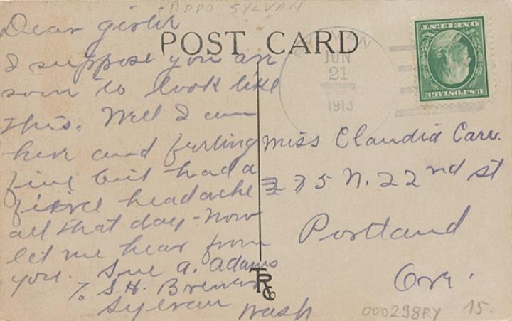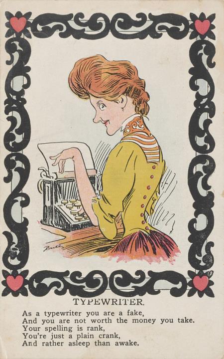 Illustrierte Postkarte; Grafik, polychrom Rückseite: Sekretärin mit Schreibmaschine; dekorative Umrahmung, darunter Text in Versform Vorderseite: beschrieben; adressiert an Miss Carr., Portland; Briefmarke U.S. Postage One Cent; Poststempel Sylvan/Jun 21 1913