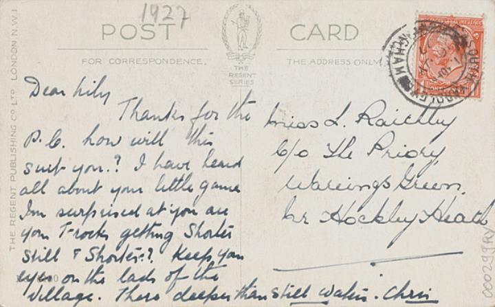 Illustrierte Postkarte; Grafik, polychrom; Nr. 3190 Rückseite: Sekretärin mit Schreibmaschine (Rundbild) und beim Spazieren entlang der Uferpromenade in Begleitung eines Mannes Vorderseite: beschrieben, adressiert; Briefmarke Postage Revenue (U.K.) One Penny; Poststempel South Yardley/16 JY 1907